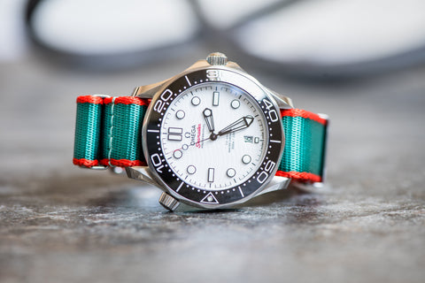 Our luxury nylon watch strap, AlphaShark, in teal with orange piping. Crafted from high tensile strength nylon webbing with deluxe hardware, including a premium stainless steel buckle and flat stainless steel keepers. The nylon is weaved to provide a softer feel with a higher sheen than standard nylon straps. Superior to standard nylon straps, the AlphaShark, is comparable to far more expensive offerings.