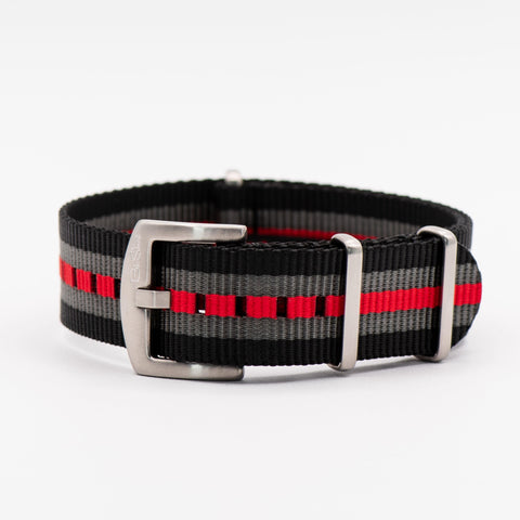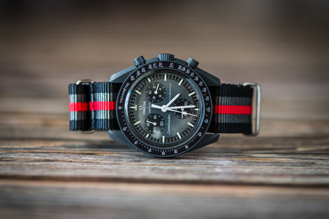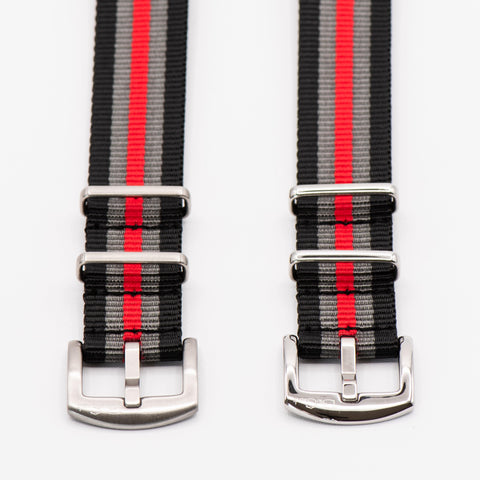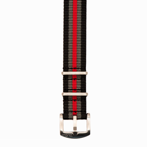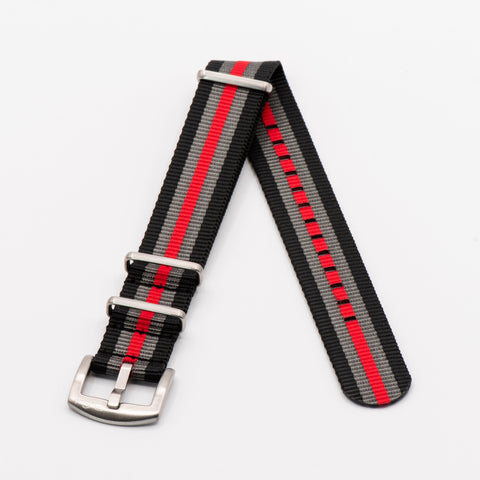 A variation of our flagship Bond strap, Bond with Red replaces the middle black stripe of a Bond strap with a deep red stripe. A classic look while providing enough color, it pairs well with white, silver, and black dials, particularly those with red accents. All BluShark straps are cleanly stitched around stainless steel hardware.