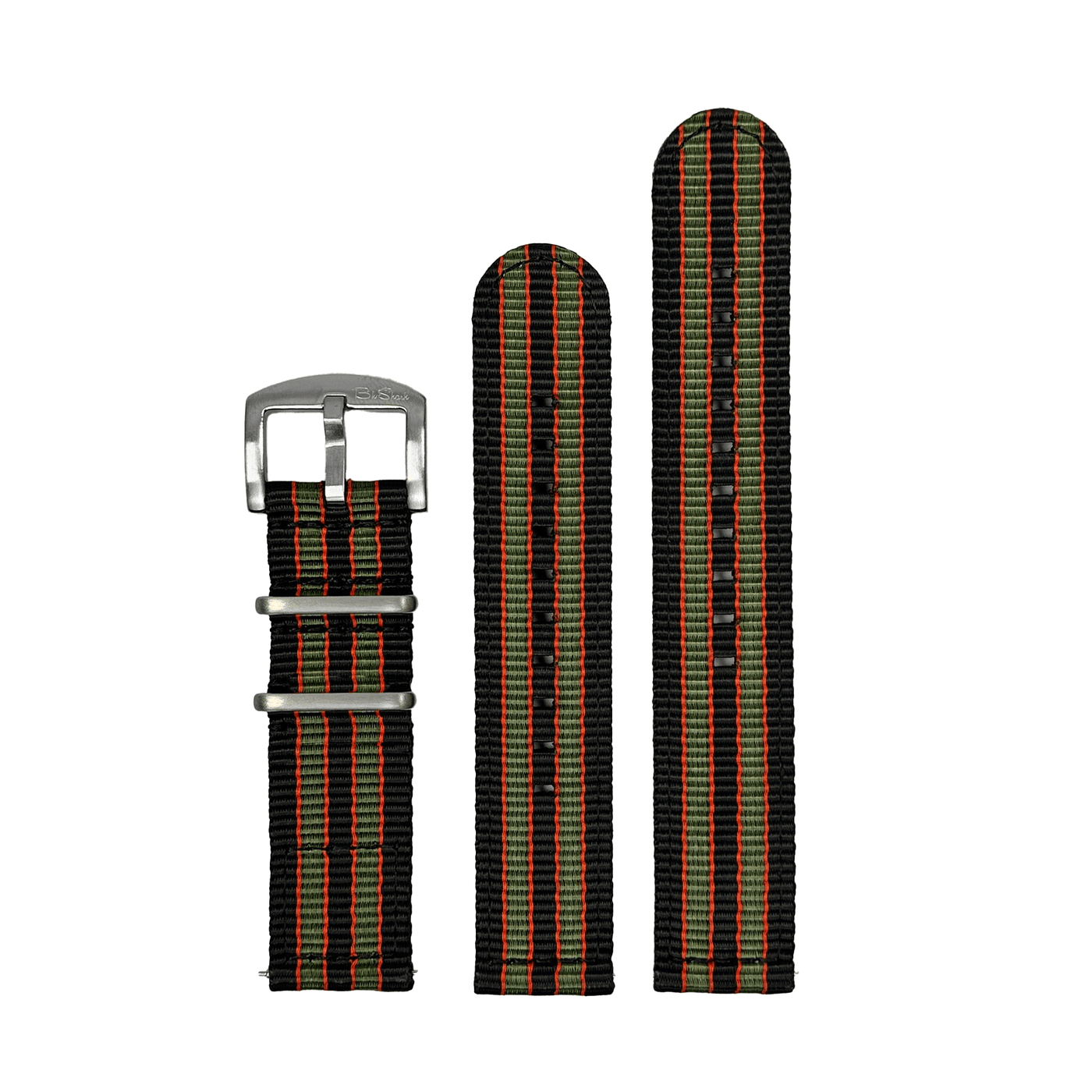 Vintage Bond: A timeless black strap featuring bold green and red stripes that evoke a classic, vintage style. It pairs seamlessly with dials in white, gray, or additional tones of green and red for a refined and nostalgic appearance.