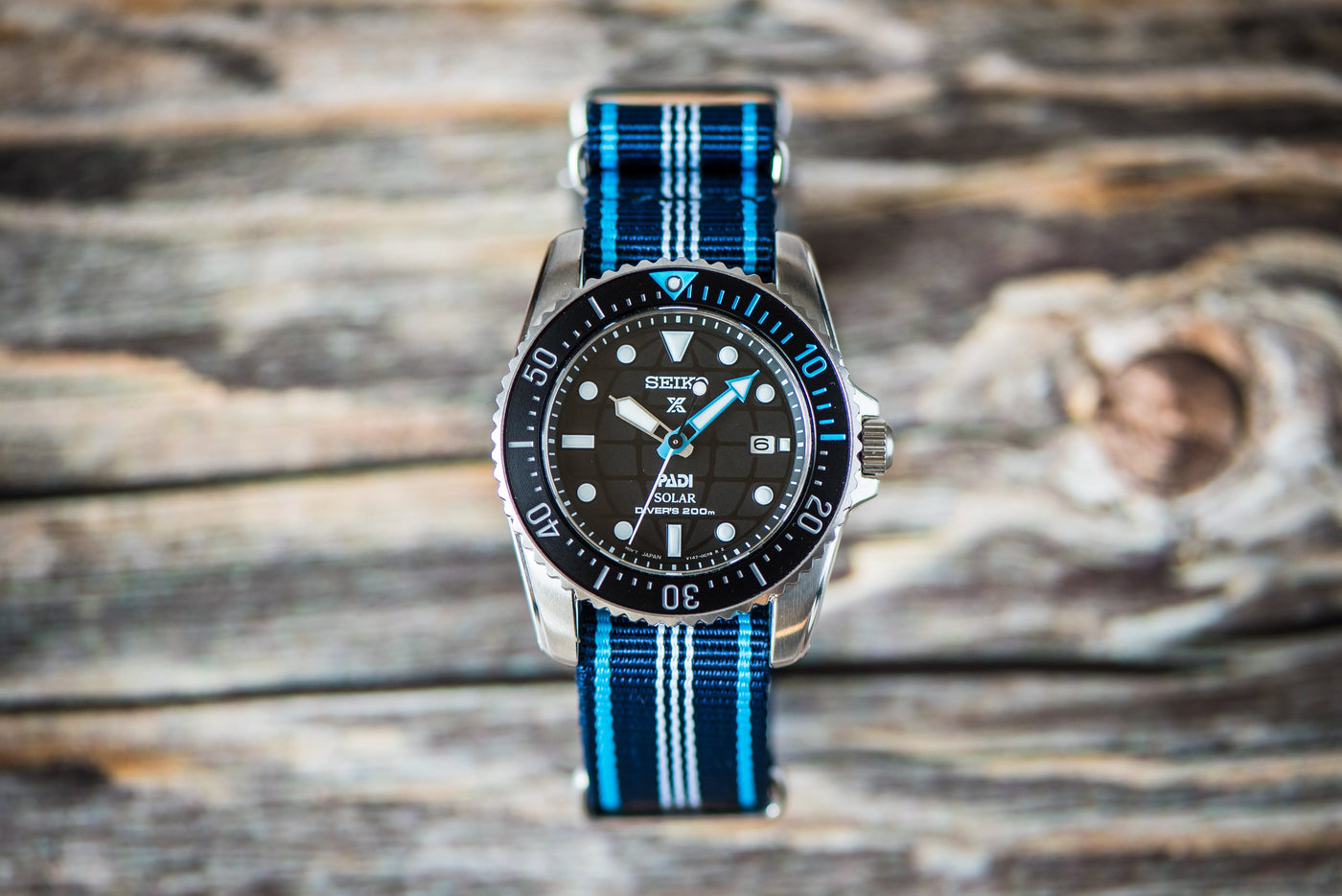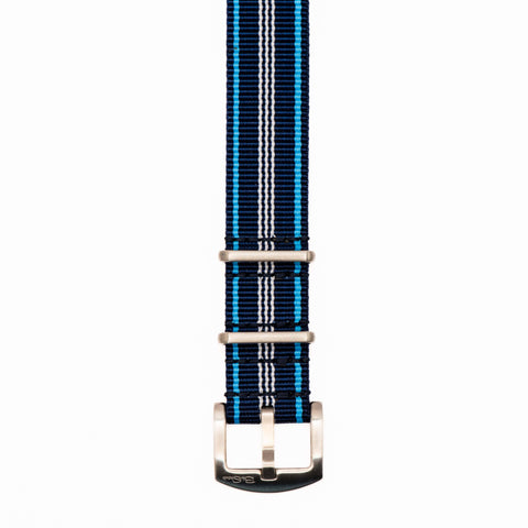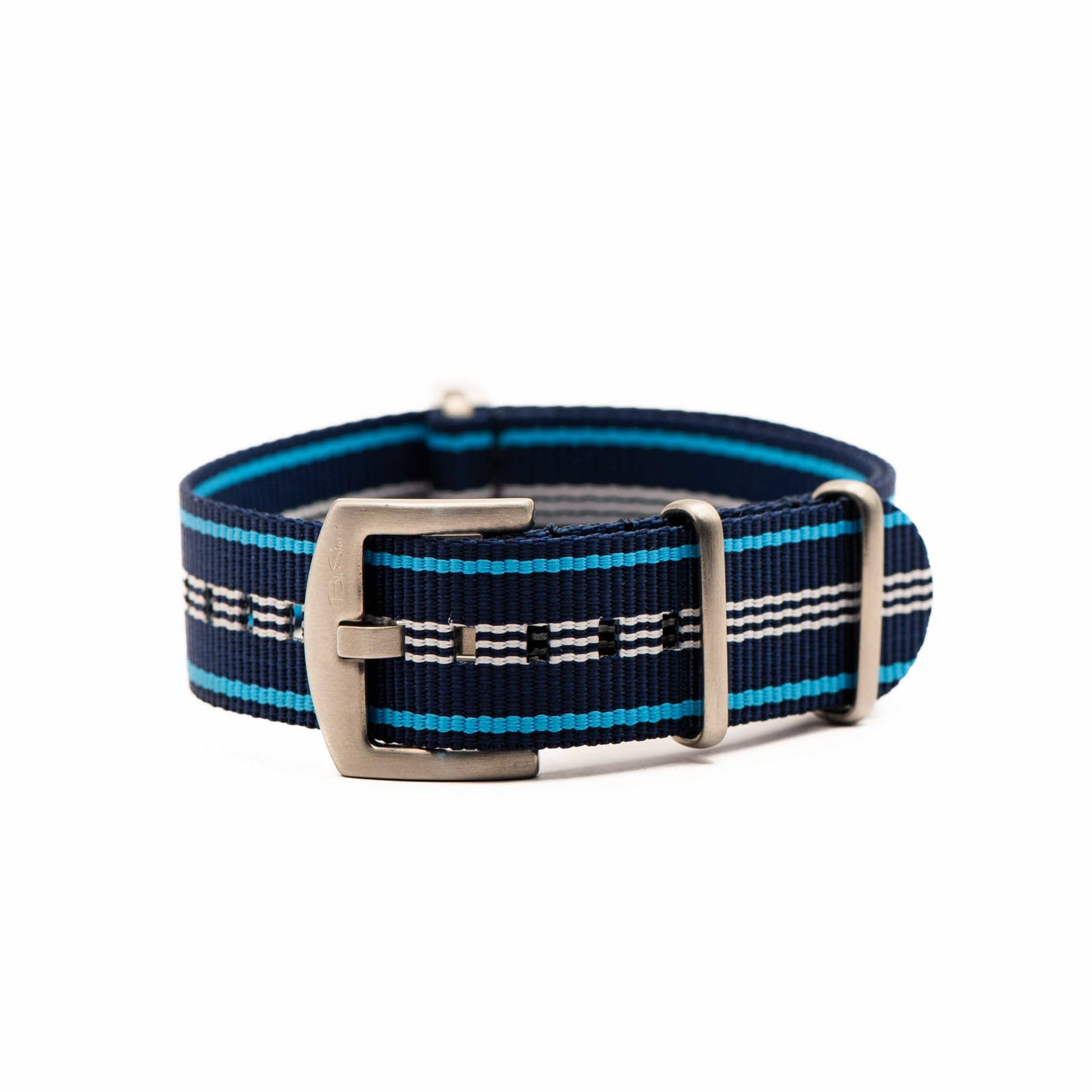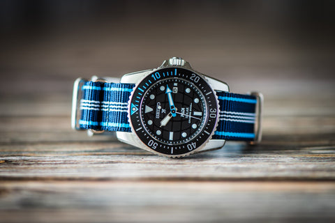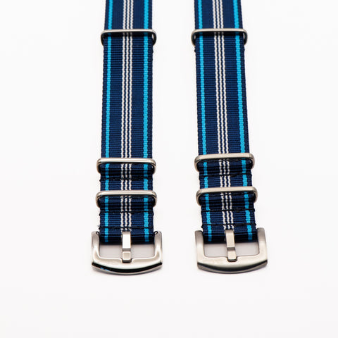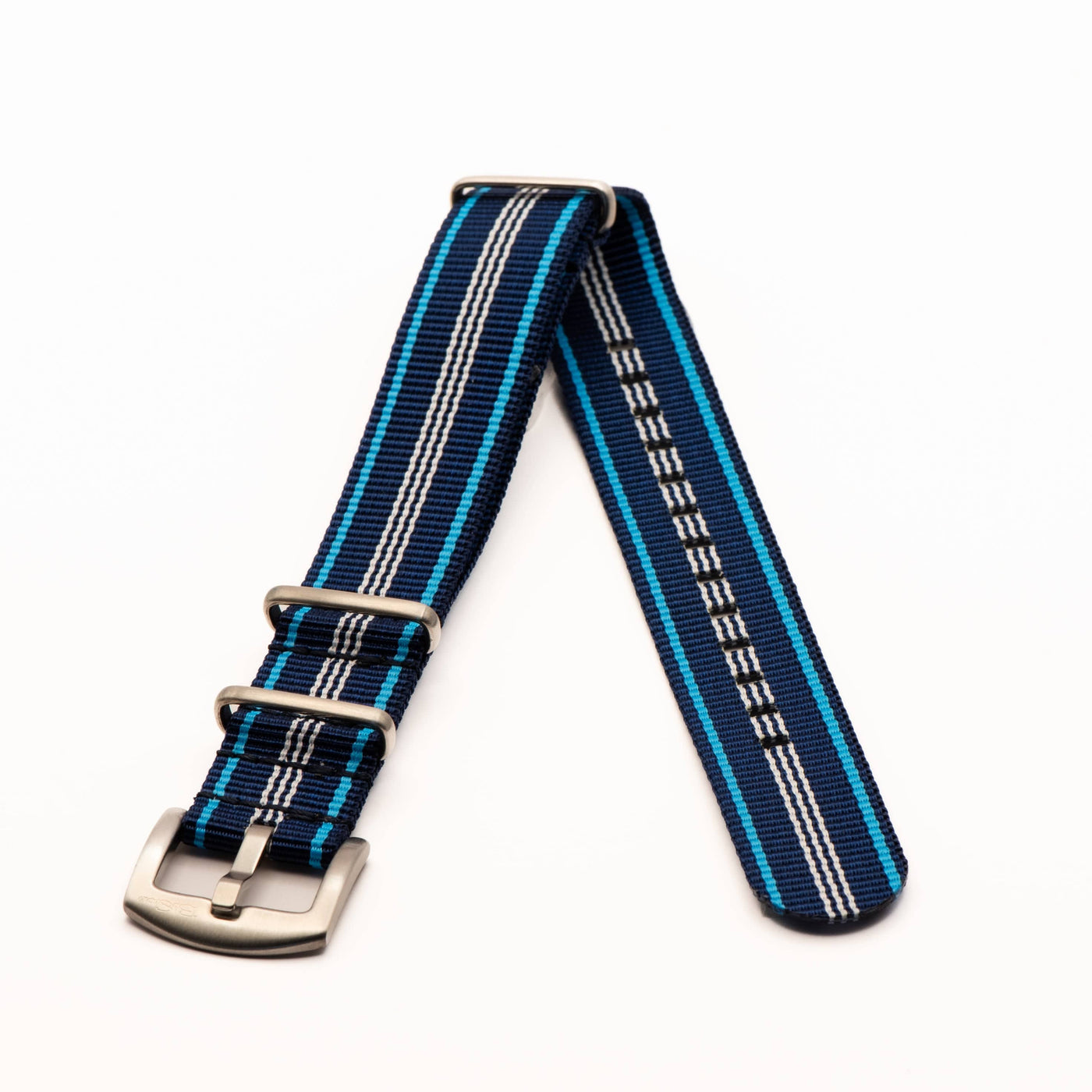 Blue Tide is one of our newest offerings and we haven't seen it elsewhere. This strap contrasts a beautiful shade of deep navy blue with a brighter shade, somewhere between Carolina blue and electric blue. It pairs well with dive watches or watches with blue, white, cream, or orange dials. All BluShark straps are cleanly stitched around stainless steel hardware. Please note that the BluShark brand is not etched into the buckles of this particular model.