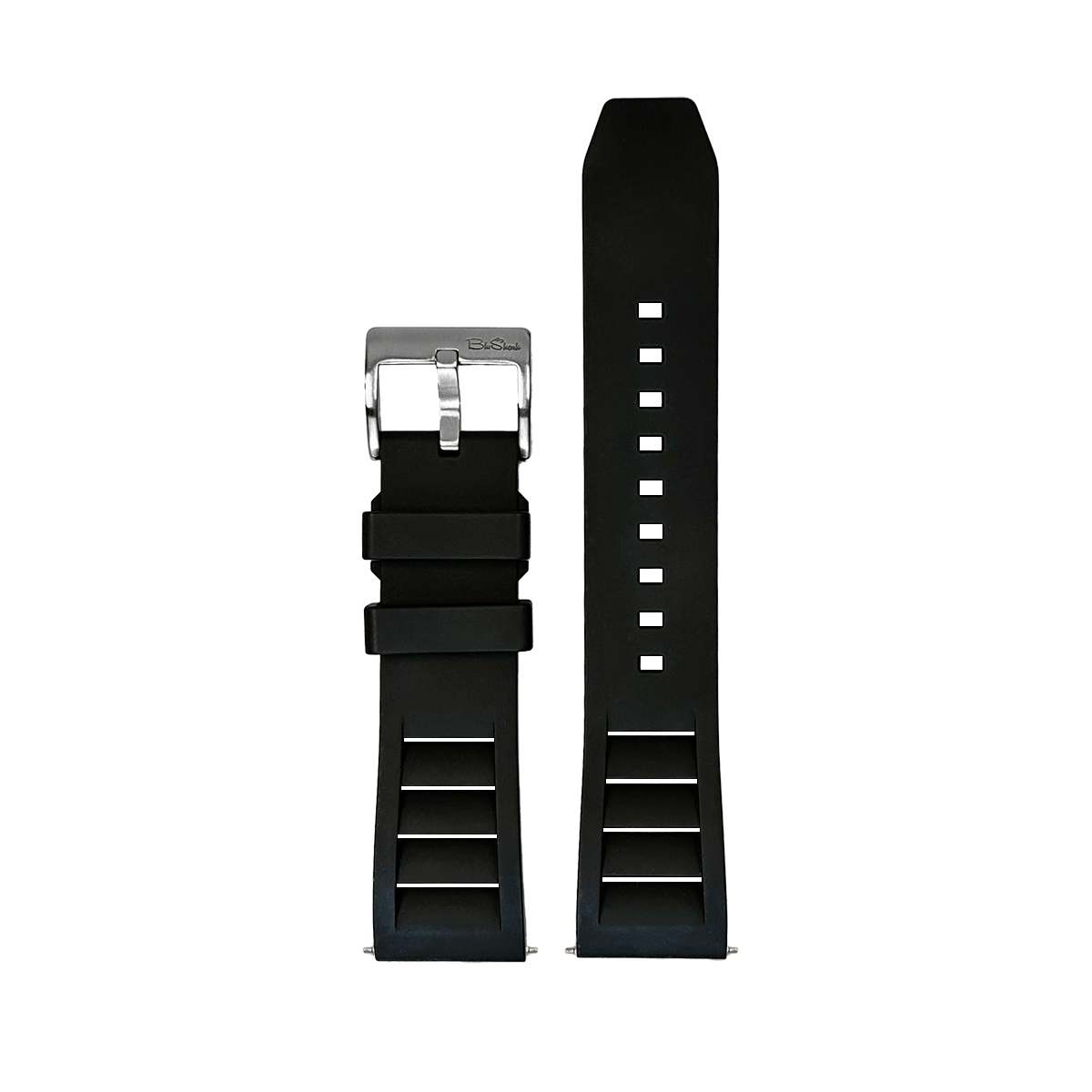Made from premium FKM rubber, it features durable stainless steel hardware in Brushed or PVD Black, two keepers, and quick release pins for easy strap changes. The strap is 3.3mm thick and the two pieces measure 78mm x 125mm with a 2mm taper. The strap is slightly curved at the lug connection for a comfortable fit right out of the package.