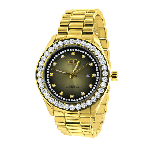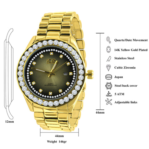 44MM CZ Iced Out Hip Hop Gold Alloy Quartz Watch Mens