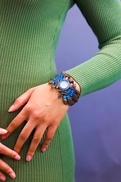 Antique Indigo Brass Watch Bracelet With Blue Beads