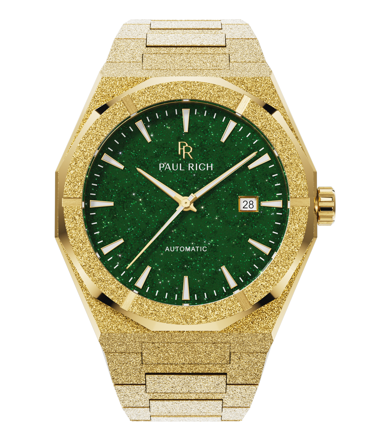 Bold. Rare. Unforgettable. A deep green aventurine dial that mirrors a midnight sky, wrapped in stainless steel with a frosted finish that shines like diamond dust. This isn’t just a watch—it’s art on your wrist. Elevated. Timeless. Unmatched.