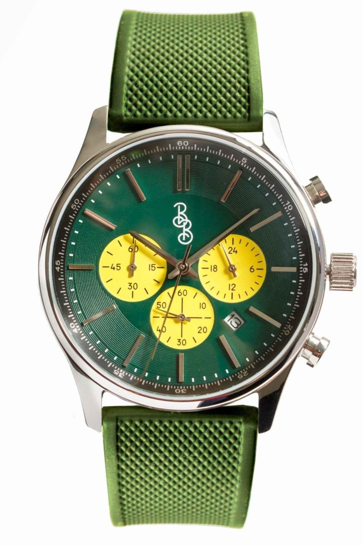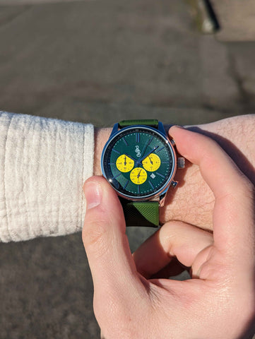 Look And Feel Great: With a 41mm case diameter and 11.5mm height, the sizing is perfect for most wrists. The Green and Yellow Chronogragh also features a domed crystal which elevates its style perfectly for game day, while being versatile enough for an every day outfit.
