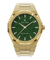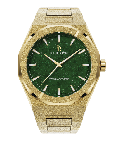 Bold. Rare. Unforgettable. A deep green aventurine dial that mirrors a midnight sky, wrapped in stainless steel with a frosted finish that shines like diamond dust. This isn’t just a watch—it’s art on your wrist. Elevated. Timeless. Unmatched.