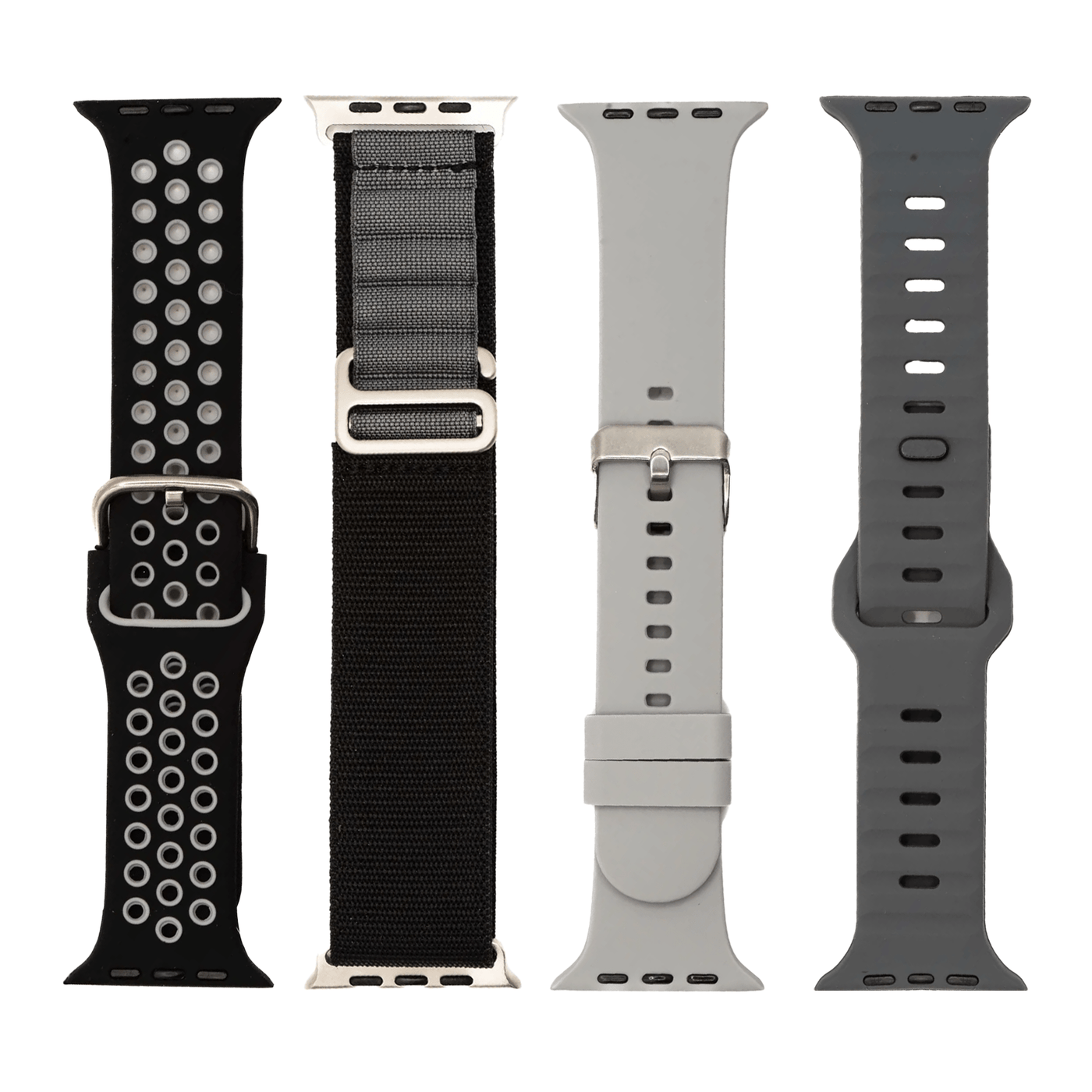 Apple Band - Monochrome - Essentials - 4 Pack Bundle - Large Apple Watch & ULTRA (42/44/45/46mm) / Groove Gray - Multiloop B&G - Silicone Solid Gray - Silicone Sport B&G