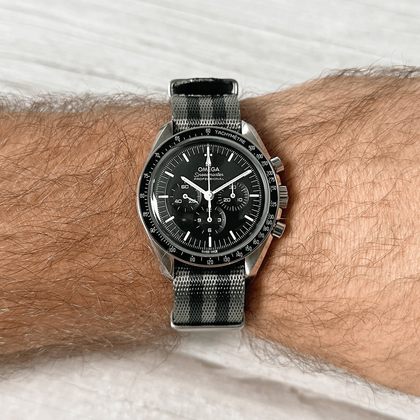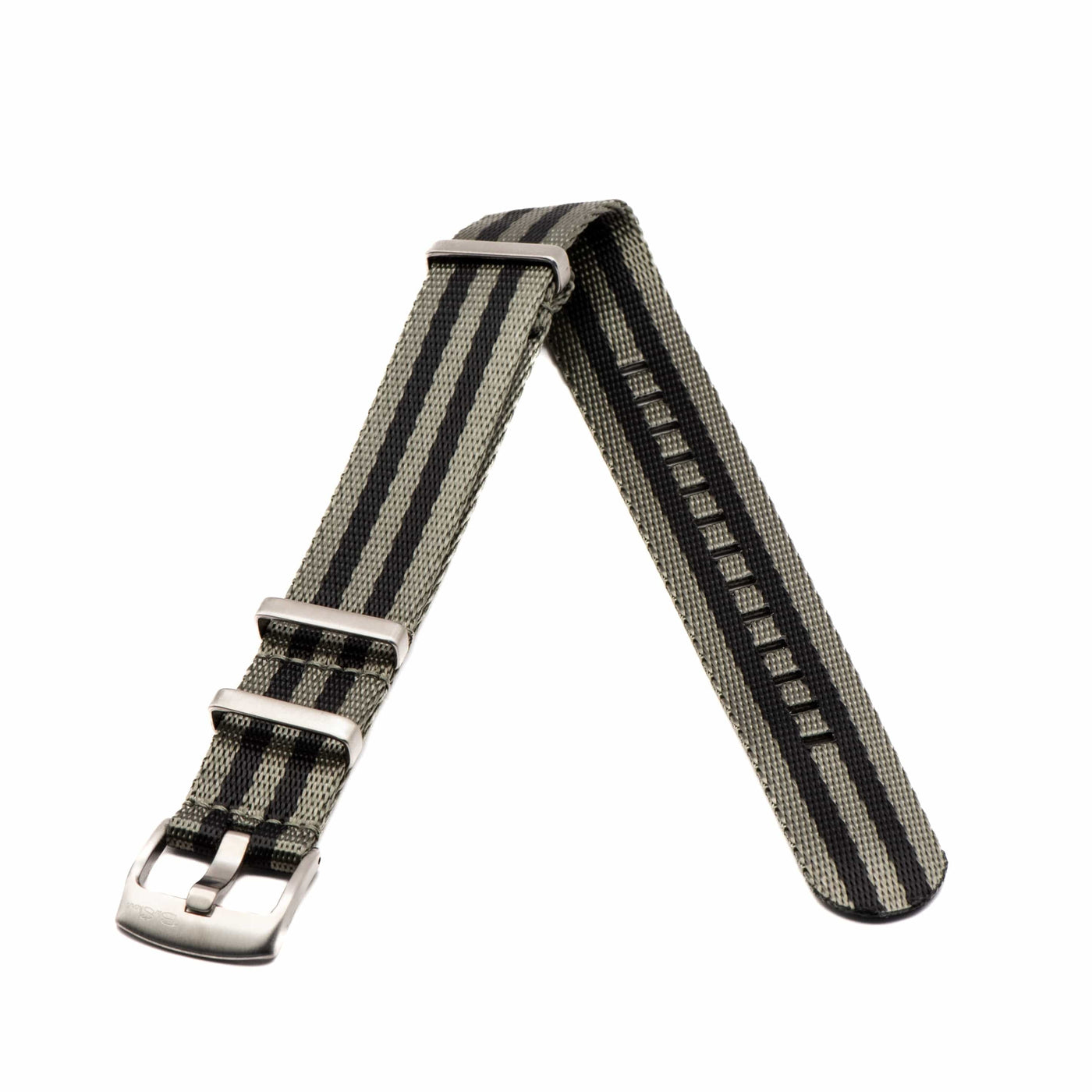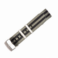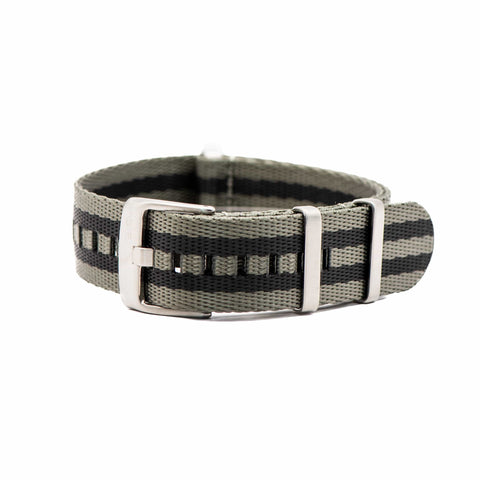 Our luxury nylon watch strap, AlphaShark, in the classic Bond pattern, but with the colors reversed for a twist. Gray is the dominant color of this strap with black stripes. Crafted from high tensile strength nylon webbing with deluxe hardware, including a premium stainless steel buckle and flat stainless steel keepers. The nylon is weaved to provide a softer feel with a higher sheen than standard nylon straps. Superior to standard nylon straps, the AlphaShark, is comparable to far more expensive offerings.