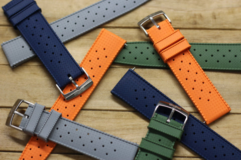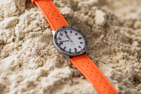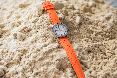 Inspired by the 1960's Swiss-made rubber TROPIC straps, we decided to create our own take on this beloved vintage rubber watch band. When swimmers and outdoorsmen wanted an alternative to the traditional steel bracelet, they found the solution in these waterproof and durable straps. Our Tropical style rubber watch straps are super soft, super flexible, sweat-proof, and perfect for everyday use.