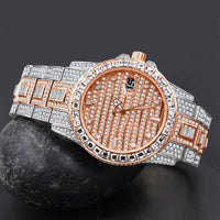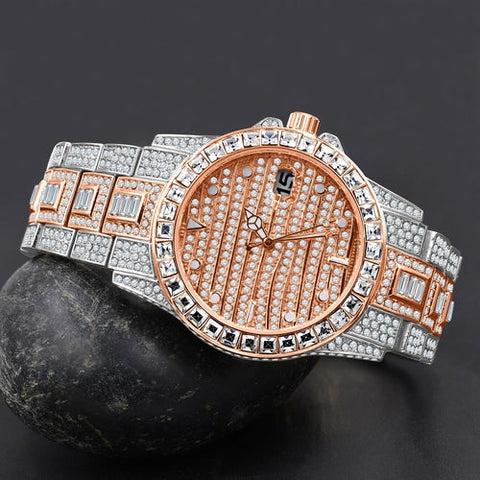 This bling watch blends hip hop attitude with wearable design — the alternating baguette and round-style CZ accents on the bracelet give texture and depth, while the rose-gold pavé dial adds warmth against the polished alloy case. It’s an easy way to upgrade streetwear, stage outfits, or party looks without breaking the bank.