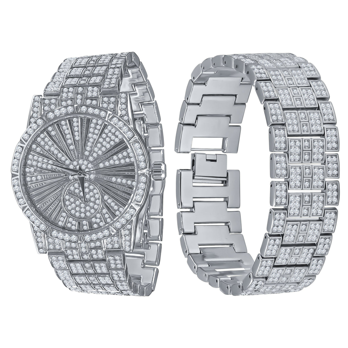 Crystal Iced Dress Watch And Bracelet Set Polished Silver En solde