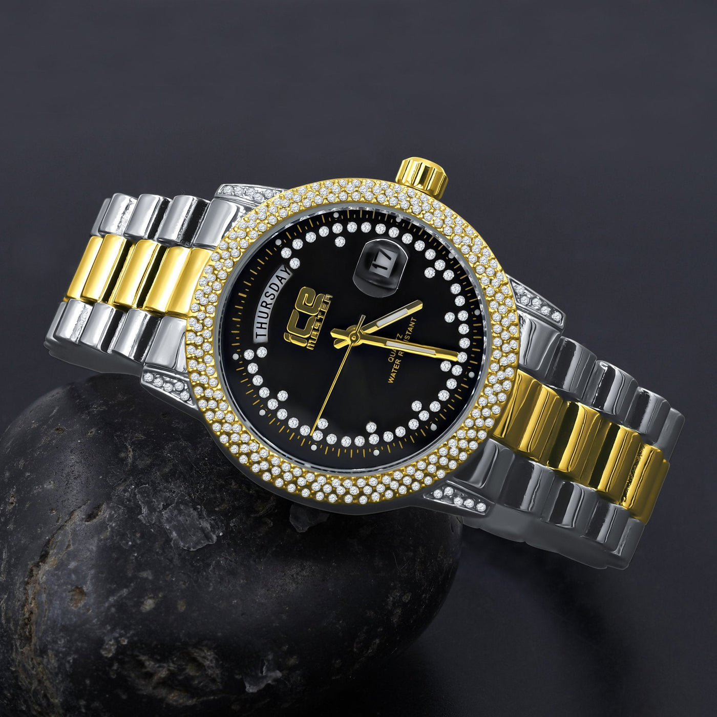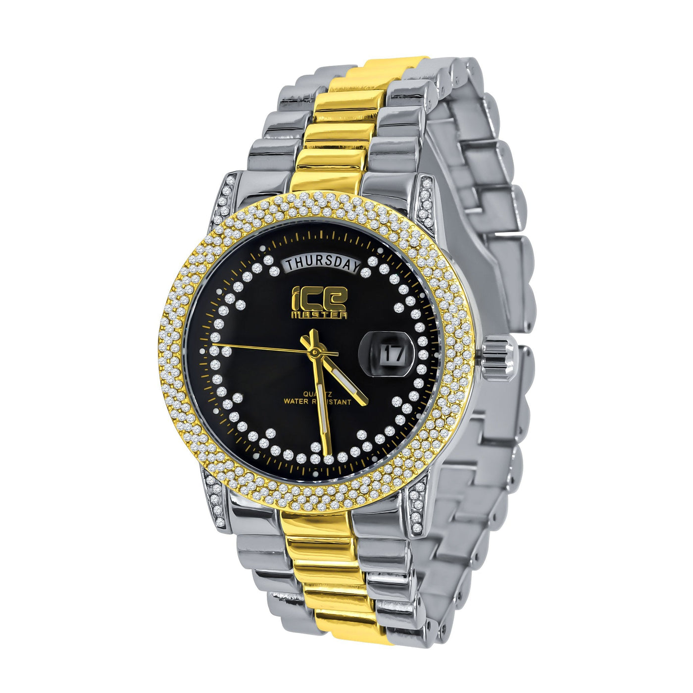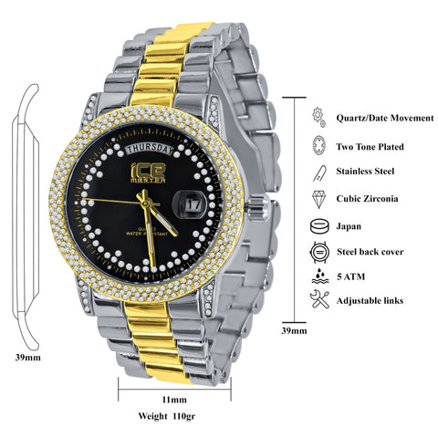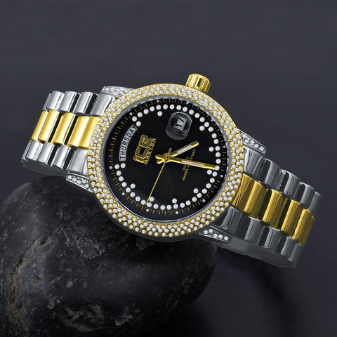Mens 39mm Hip Hop Two Tone CZ Bezel Day Date Luxury Watch