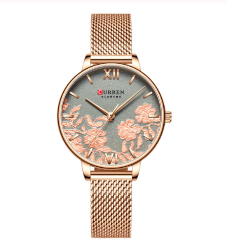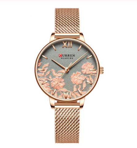 Women's Rose Gold Floral Dial Slim Mesh Strap Watch